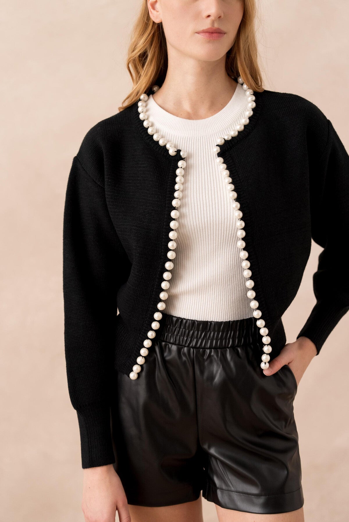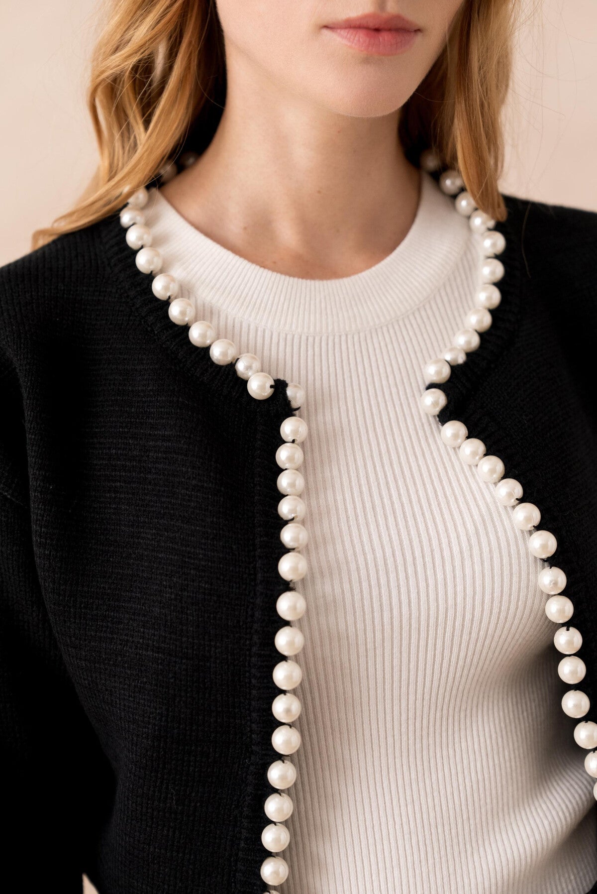 Diese Perlenweste ist ein stilvolles Highlight für jede Garderobe. Der klassische schwarze Farbton wird durch die edle Perlenverzierung entlang der Vorderseite raffiniert ergänzt und verleiht dem Look einen Hauch von Luxus.