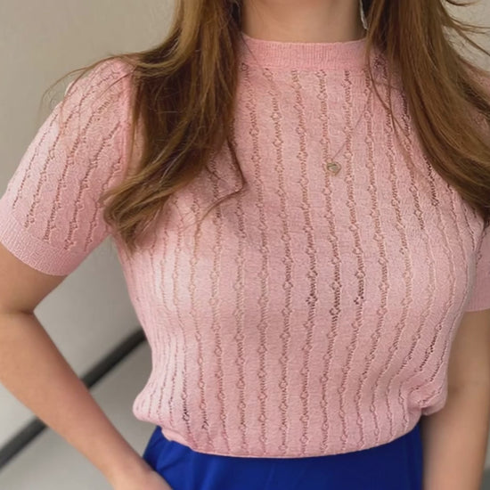 Dieses feminine Feinstrick-Top in zartem Rosé bringt Leichtigkeit und Eleganz in deinen Look. Mit seinem zarten, durchbrochenen Strickmuster und der figurbetonten Passform ist es das perfekte Piece für Frühling und Sommer. Der klassische Rundhalsausschnitt und die kurzen Ärmel machen das Top vielseitig kombinierbar – ob casual zur Jeans oder elegant mit Rock und Blazer.